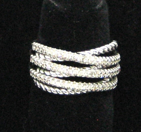 This captivating wide band ring is adorned with six overlapping strands, 3 of diamonds for multi-dimensional sparkle. Total weight is 5.3 grams. Capture the look of several stacked rings in one with this layered 14k white gold and 0.6ct diamond fashion ring Size 6