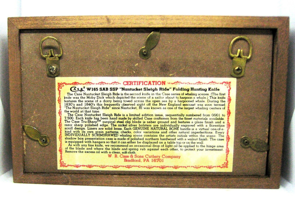 Case XX Stainless USA 1 Dot (1980) W165 SSP SAB Scrimshawed Bone "Moby Dick Nantucket Sleigh Ride" in Original Showcase - Limited Edition - Serial # 1297 - Stainless Steel - Beautifully Scrimshawed Bone Handles - No Cracks - Engraved Nickel Silver Bolsters - Brass Liners - Snaps Open and Shut - No Wobble - New Old Stock Vintage Condition in the Original Wood Display - COA is attached to the bottom of the Display - 5 1/4 inches closed. Still has factory edge. Never sharpened, carried, or cleaned. No chips or cracks in handles. Perfect!!