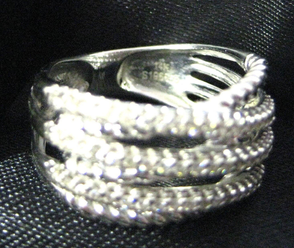 This captivating wide band ring is adorned with six overlapping strands, 3 of diamonds for multi-dimensional sparkle. Capture the look of several stacked rings in one with this layered 14k white gold and 0.6ct diamond fashion ring