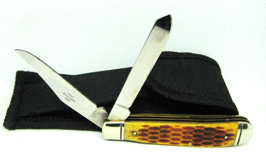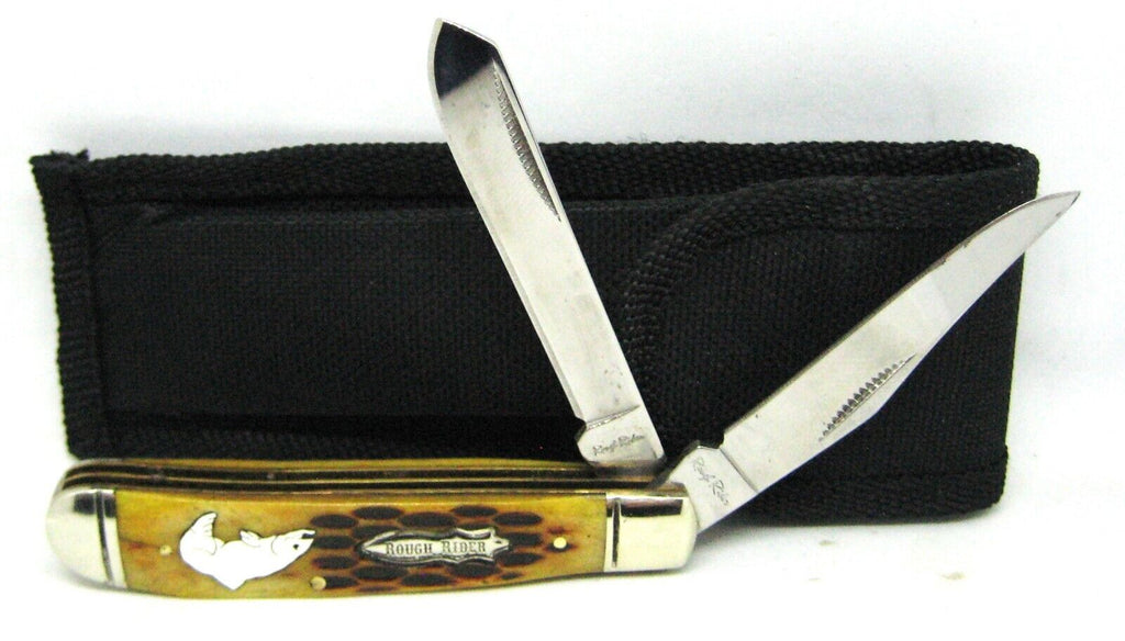 Rough Rider Pocket Knife Two Blade 440 SS Trout Logo Stag Bone Handle New