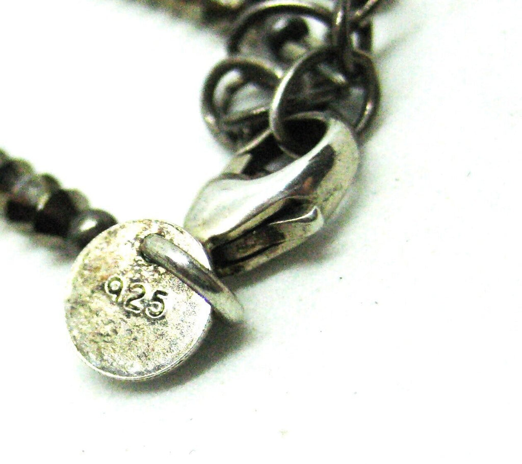 A sterling silver/gold and resin necklace from the 1980s. This attractive 18" length necklace, with resin stones and 925 sterling silver clasps is made by Emily Ray. The "mesh" hart in sterling silver gilded in gold and ceramic flowers on both sides. It has a hook clasp with a safety loop, it is stamped 925 and Emily Ray. It weighs 11.2 grams and it is in Mint Like New condition with no chips, cracks, dents, bends, corrosion, damage or repairs.