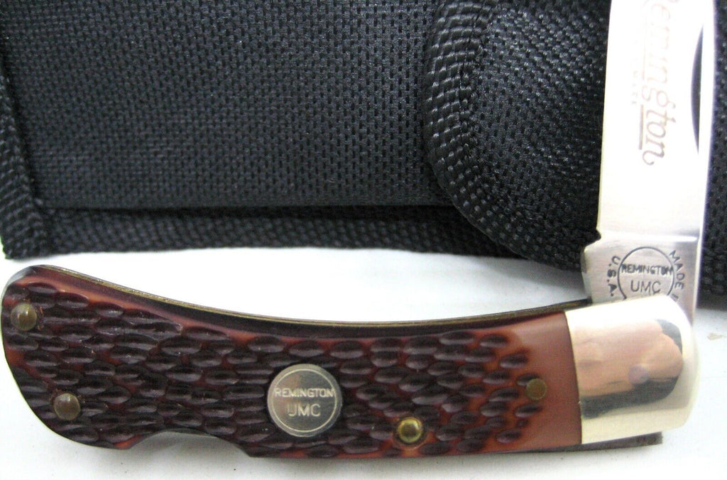 NEW Remington UMC USA R5 Delrin Gentleman Lockback Knife - NIB - Delrin Handles - No Cracks - Nickel Silver Bolsters - Brass Liners - Locks up Tight - No Wobble - New Condition in the Original Remington Box with Paper - Approx. 3 1/8 inches closed. Never Sharpened, Carried, or Cleaned. No chips or cracks on the handles.