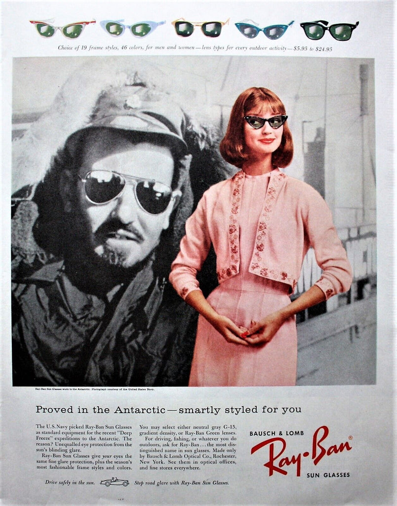 "Operation Deep Freeze was a series of expeditions between 1955 and 1998, signaling a renewal in American interest in the Antarctic. These expeditions were military operations run and supported by various American military agencies. Rear Admiral Byrd was Officer in Charge; and so the most senior US representative monitoring political, scientific, legislative and operational activities making up the US Antarctic programs" Made by B&L to give perfect vision to pilots and the USN sailors and service men in the snow at below zero temperatures. The G31 Double Gradient Mirror, combined with the Kalichrome lens, protected them from getting snow blind.
